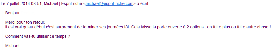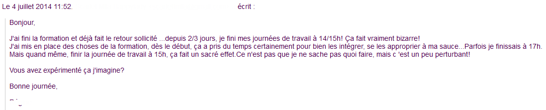 J’ai mis 4 ans avant de créer Efficacité Zen, ma formation à la gestion du temps. Elle marche bien. J’ai reçu récemment un email d’une participante :