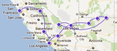 Le parcours est simple : passer une semaine à San Francisco, 2 jours dans le parc de Yosemite, 4 jours à Los Angeles, puis faire un tour par le Grand Canyon, Monument Valley, Antelope Canyon suivis de 4 jours à Las Vegas et terminer le tout par une autre semaine à San Francisco. Distance a parcourir : 3700 kilomètres.