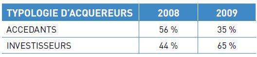 La typologie des acquéreurs en dit long avec un marché 2009 dominé par les investisseurs comme l’indique la note de conjoncture des notaires d’avril 2010. Sans le dispositif Scellier, le marché aurait probablement une mine déconfite et nos pauvres agents immobiliers auraient dû tous revendre leur Cayenne 😉