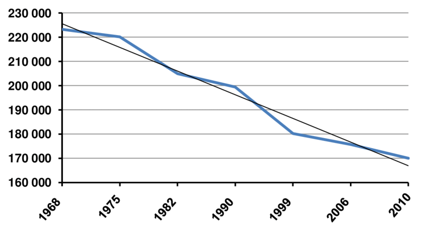 La population diminue d’année en année (1968-2010). Source : https://www.researchgate.net/figure/Evolution-de-la-population-de-la-commune-de-Saint-Etienne-1968-2010_fig3_318276757